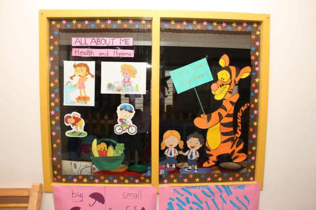The classroom decoration is built on the theme Winnies all around. It comprises of colorful charts depicting numbers, alphabets, etc. The charts have Winnie the Pooh playing under a tree, pictures of students, and a Winnie juggling glittery clocks depicting various activities.