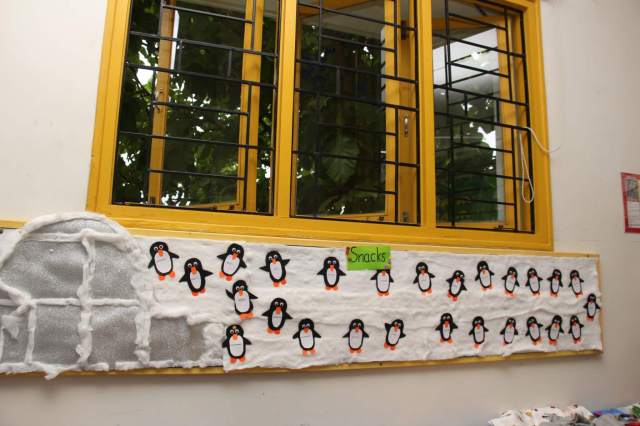 The theme for this classroom is Buzzing Busy Bees. The teachers made cute little bees with the students’ pictures depicting their mischievousness in the classroom. The charts have colorful pots oozing with golden honey and some cute little honey bees depicting various activities for the students.